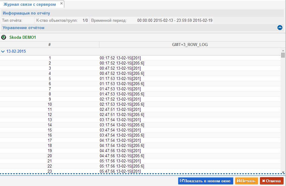Отображает активность устройства (трекера) по обмену данных с сервером ISMO4 в хронологическом порядке. Данный вид отчета является служебным и необходим для диагностики работы устройства в случае обнаружения проблем. При стабильной работе устройства в текущем журнале нет необходимости.