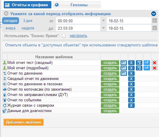 - Выбор геозон - при выбранных геозонах для создаваемого шаблона отчета. Информация в отчете будет включена только за период движения внутри выбранных геозон. Будьте внимательны при включении геозон в шаблон отчета.