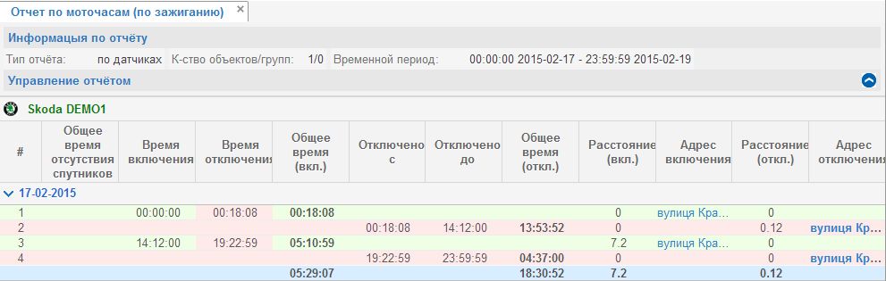Данный отчет входит в список стандартных отчетов. Он отображает информацию о включении и выключении зажигания транспортного средства. Моточасы - это время работающего двигателя автомобиля. Как известно, во время включения зажигания и запуска двигателя напряжение бортовой сети изменятся в сторону увеличения. При выключении - в сторону понижения.